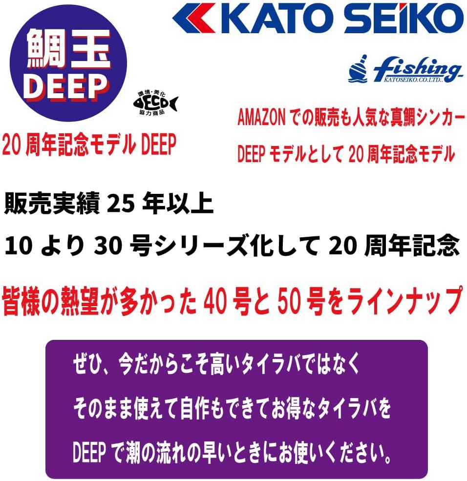 2025-12-07 全国販売店様へ真鯛シンカーDEEPモデルが出荷開始。 全国販売店様へ真鯛シンカーDEEPモデルが出荷開始。 発売から25年のロングセラー商品。 無垢の真鯛シンカーとして20周年記念モデルの 真鯛シンカーDEEP40&50をぜひお求めください。 ルアーOEM制作依頼はKATO SEIKOへ